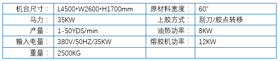- 所用压敏热熔胶不含溶剂,是理想的绿色环保胶粘剂; - 热熔胶不含水分,无需烘干,节省电量,生产速度快; - 所用热熔胶粘合牢度强,用少量胶就可达到传动胶粘剂的强度; - 热源为油热,加热速度快,热量均匀; - 独立的熔胶系统,使胶水充分的熔融,融解速度快; - 雾状的喷胶设计,成品手感好,牢固稳定; - PLC人机界面操作友好,自动布料张力系统,材料无拉伸变形; - 专利涂胶系统,精度可达0.01mm,调节简单准确; - 机台人性化设计,操作简单,节省操作人员。
